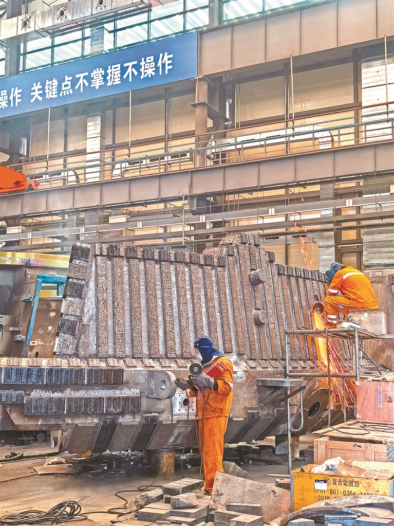中铁智能化高端装备产业园铆焊车间内,工作人员正在清理打磨盾构机刀盘边块。沈东方